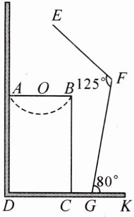 12. (东营河口区期中)如图,这是小强洗漱时的侧面示意图,洗漱台(矩形 $ ABCD $)靠墙摆放,高 $ AD = 80 cm $,宽 $ AB = 48 cm $,小强身高为 $ 166 cm $,下半身 $ FG = 100 cm $,洗漱时下半身与地面成 $ 80^{\circ} (\angle FGK = 80^{\circ}) $,身体前倾成 $ 125^{\circ} (\angle EFG = 125^{\circ}) $,脚与洗漱台的距离 $ GC = 15 cm $(点 $ D $,$ C $,$ G $ 在同一条直线上),此时小强的头部 $ E $ 与地面 $ DK $ 的距离是多少?(结果精确到 $ 0.1 cm $,参考数据:$ \cos 80^{\circ} \approx 0.17 $,$ \sin 80^{\circ} \approx 0.98 $,$ \sqrt{2} \approx 1.414 $)