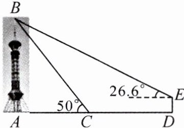 11. (泰安中考)在一次综合实践活动中,某学校数学兴趣小组对一电视发射塔的高度进行了测量. 如图,在塔前 $ C $ 处,测得该塔顶端 $ B $ 的仰角为 $ 50^{\circ} $,后退 $ 60 m (CD = 60 m) $ 到 $ D $ 处有一平台,在高 $ 2 m (DE = 2 m) $ 的平台上的 $ E $ 处,测得 $ B $ 的仰角为 $ 26.6^{\circ} $,则该电视发射塔的高度 $ AB $ 为