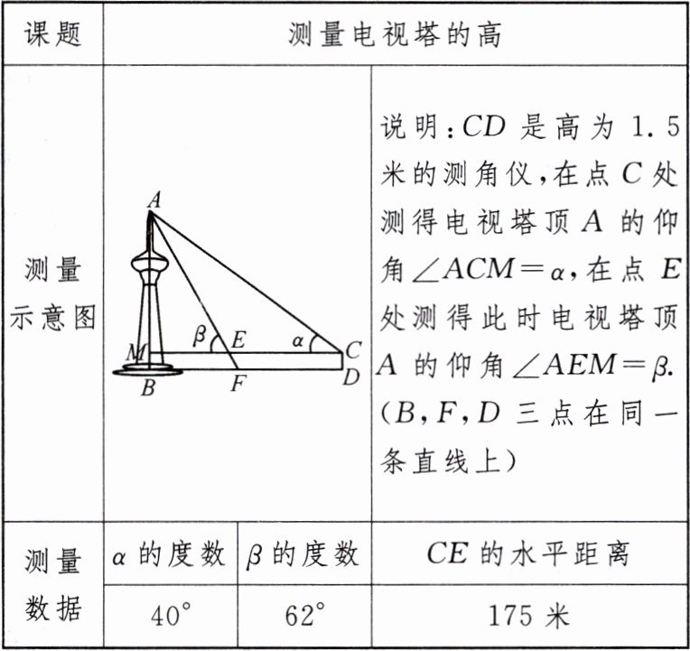 (1)请根据上表中的测量数据,求电视塔的高 $ AB $ 约为