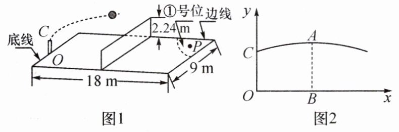 11. (绍兴中考)如图 1,排球场长为 $ 18 $ m,宽为 $ 9 $ m,网高为 $ 2.24 $ m,队员站在底线 $ O $ 点处发球,球从点 $ O $ 的正上方 $ 1.9 $ m 的 $ C $ 点发出,运动路线是抛物线的一部分,当球运动到最高点 $ A $ 时,高度为 $ 2.88 $ m,即 $ BA = 2.88 $ m,这时水平距离 $ OB = 7 $ m,以直线 $ OB $ 为 $ x $ 轴,直线 $ OC $ 为 $ y $ 轴,建立平面直角坐标系,如图 2.
