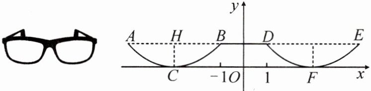 9. 【真实问题情境】(东营利津县期中)如图,这是一副眼镜镜片下半部分轮廓对应的两条抛物线,它们关于 $ y $ 轴对称,$ AB // x $ 轴,$ AB = 4 $ cm,最低点 $ C $ 在 $ x $ 轴上,高 $ CH = 1 $ cm,$ BD = 2 $ cm,则右轮廓线 $ DFE $ 所在抛物线的函数表达式为