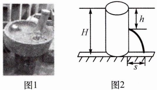 科学原理:如图2,始终盛满水的圆柱体水桶水面离地面的高度为$H$(单位:$\mathrm{cm}$),如果在离水面竖直距离为$h$(单位:$\mathrm{cm}$)的地方开大小合适的小孔,那么从小孔射出水的射程(水流落地点离小孔的水平距离)$s$(单位:$\mathrm{cm}$)与$h$的关系为$s^{2}=4h(H - h)$。