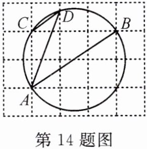 14. (扬州中考)如图,由边长为$1$的小正方形构成的网格中,点$A$,$B$,$C$都在格点上,以$AB$为直径的圆经过点$C$,$D$,则$\sin \angle ADC$的值为 (