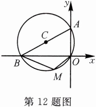 12. 如图,$\odot C$ 过原点,且与两坐标轴分别交于点 $A$,$B$,点 $A$ 的坐标为 $(0,3)$,$M$ 是第三象限内 $\overgroup{OB}$ 上一点,$\angle BMO = 120^{\circ}$,则 $\odot C$ 的半径为(