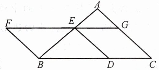 6. 如图,以BC为底边的等腰三角形ABC,点D,E,G分别在BC,AB,AC上,且$EG// BC$,$DE// AC$,延长GE至点F,使得$BE=BF$。