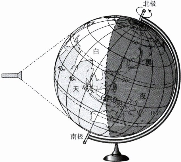 )① 地球的自转方向 ② 地球的公转方向 ③ 昼夜长短的变化 ④ 昼夜更替现象