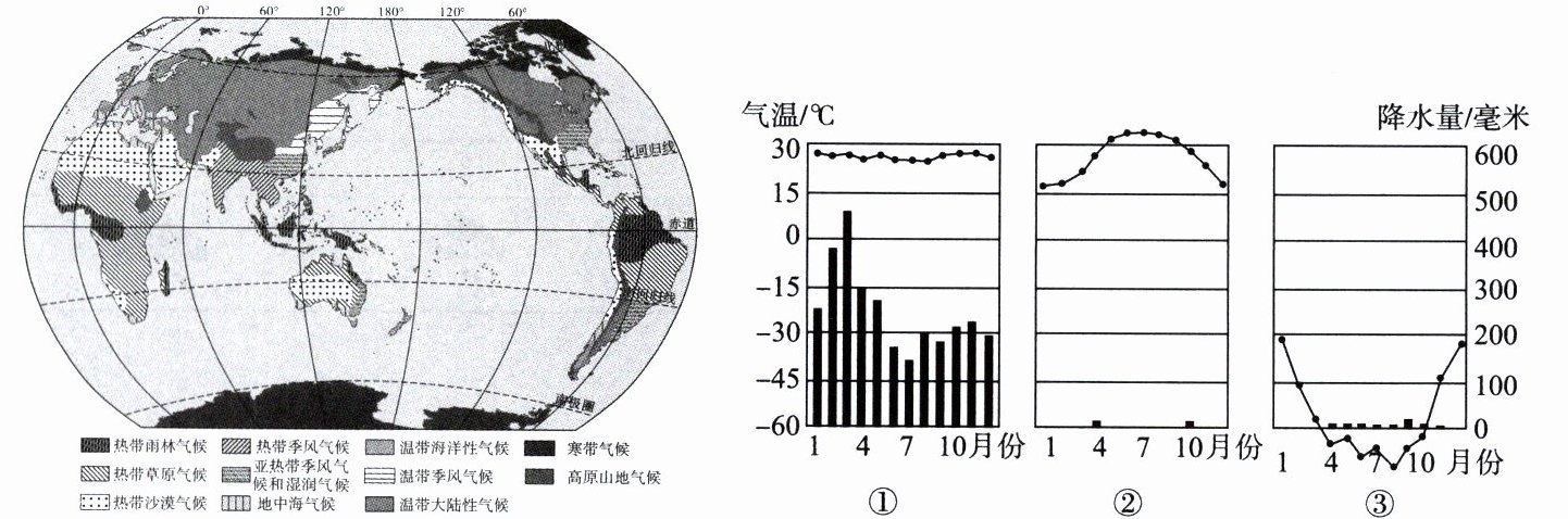 (1)热带雨林气候 全年高温多雨 赤道 (2)热带沙漠 西 全年炎热干燥 (3)寒带 纬度位置