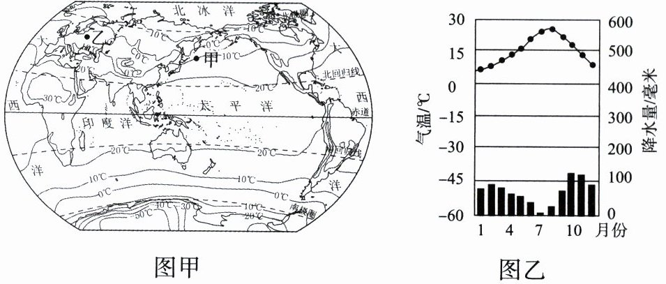 17. 世界各地冷热不同,气温的分布有很大差别,阅读等温线图,我们可以分析世界各地或某个区域气温分布的规律。图甲为世界年平均气温分布图,图乙为某地气候图。读图,完成下列问题。(24分)