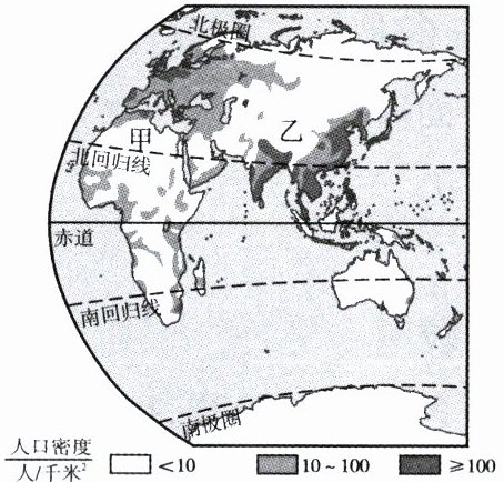 (3)根据世界部分地区人口分布图,归纳人口密度在100人/千米²以上的区域分布的纬度位置特点是