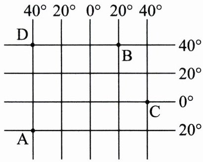 ,B地的地理坐标是(40°N,20°E)
