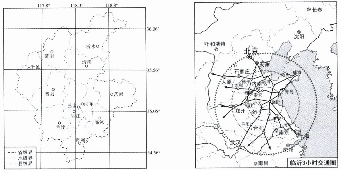 18. 临沂古称琅琊,不仅历史悠久,人杰地灵,现在的临沂更是物流之都,北方最大的商品批发市场。读临沂市地图和临沂3小时交通圈图,完成下列问题。(15分)
