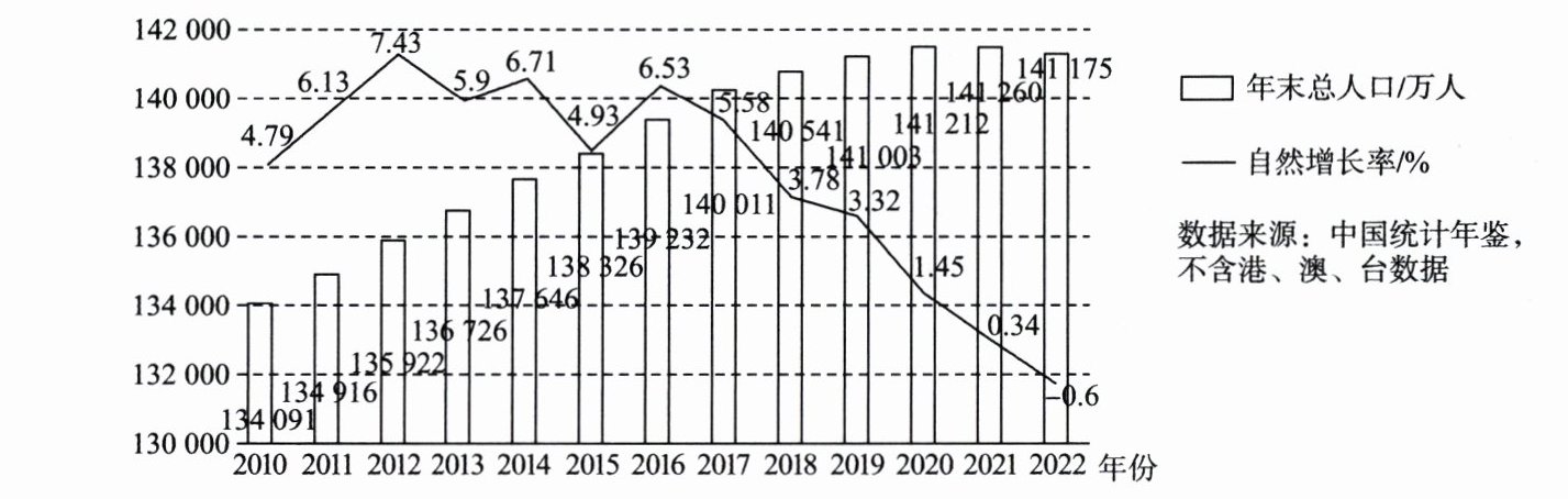 读我国2010—2022年年末总人口数及人口自然增长率图,完成3~4题。