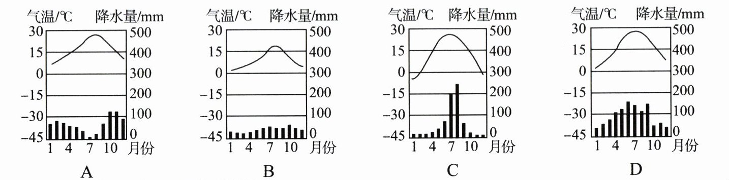 1. 下列多年平均各月气温和降水量图能反映我国北方地区气候特点的是(