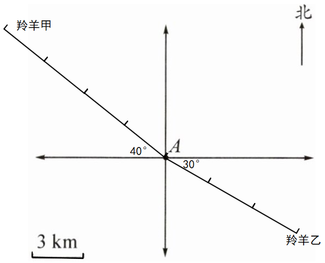 羚羊甲位于 $A$ 点西偏北 $40°$ 方向,距离 $A$ 点 $12 km$ 处。