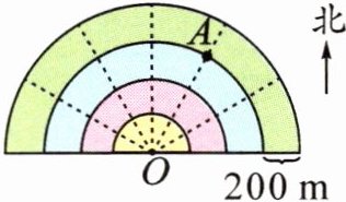 3. 如图所示,点 $A$ 在点 $O$ 的( )偏( )( )$^{\circ}$ 方向上,距离是( )$m$。