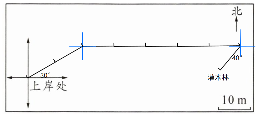 三、在人迹罕至的沙滩上,科学家监测到一只绿海龟上岸后先向东偏北 $30^{\circ}$ 方向爬行 $20m$,然后沿正东方向爬行 $50m$,最后向南偏西 $40^{\circ}$ 方向爬行 $10m$ 到达一处灌木林。