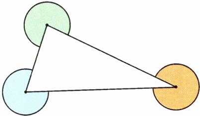 六、三个半径为$2\ cm$的圆的圆心正好在三角形的三个顶点上,你能算出涂色部分的面积吗?(提示:三角形的内角和是$180^{\circ}$)
