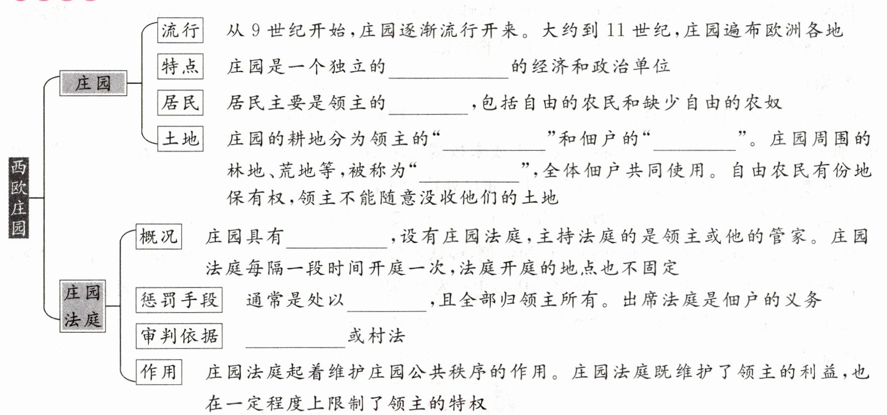 1. 从9世纪开始,欧洲流行一种新的组织。它大小不一,耕地由领主的“自营地”和佃户的“份地”组成,是一个独立的自给自足的经济和政治单位。这种组织是(