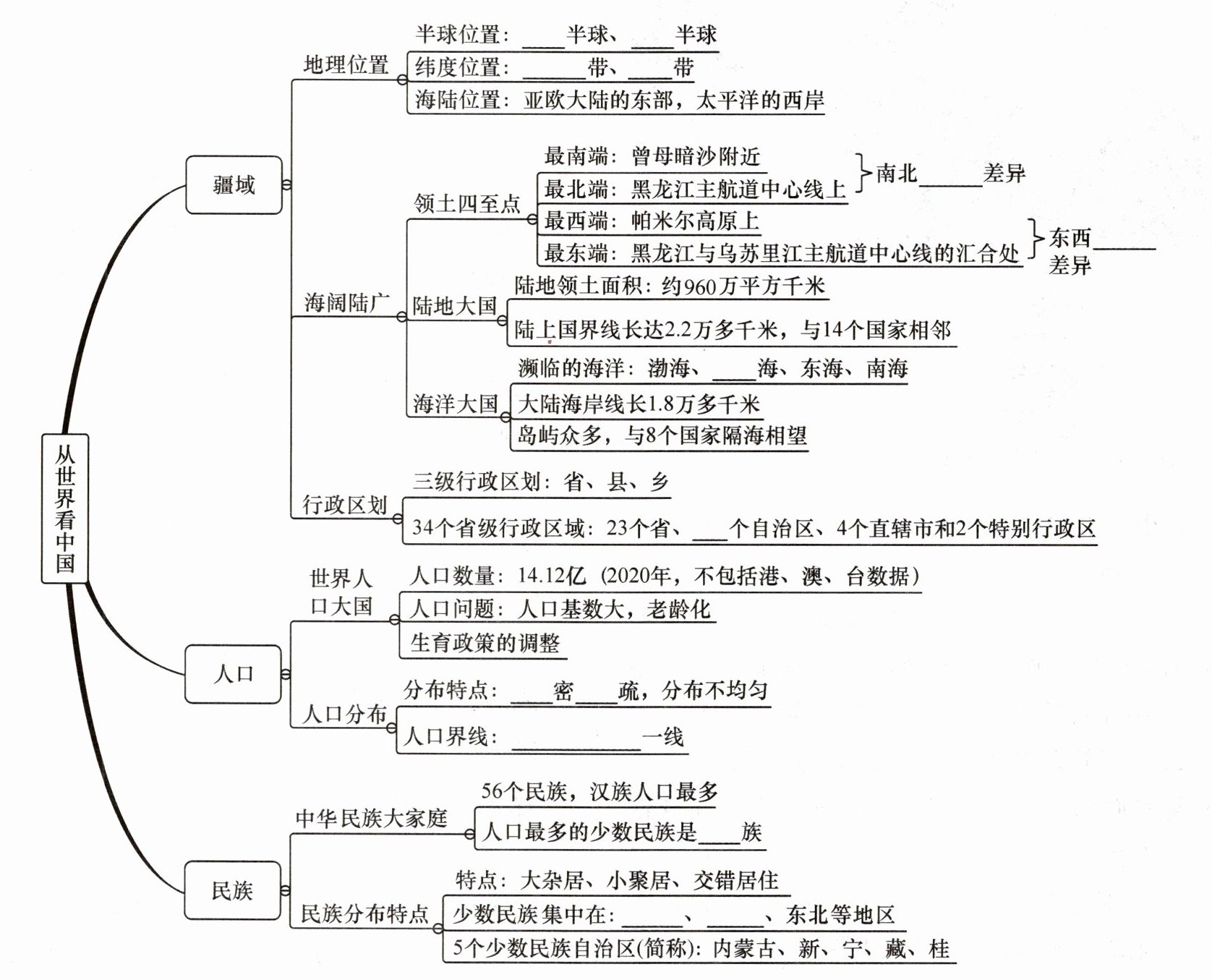 半球位置:东北半球、北半球;纬度位置:北温带、热带;濒临的海洋:渤海、黄海、东海、南海;34个省级行政区域:23个省、5个自治区、4个直辖市和2个特别行政区;人口分布特点:东西密疏,分布不均匀;人口界线:黑河—腾冲一线;人口最多的少数民族是壮族;少数民族集中在:西南、西北、东北等地区