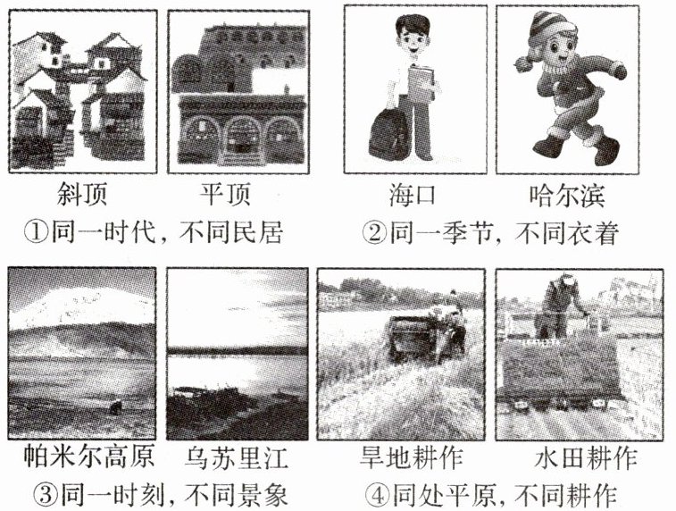 1. 我国幅员辽阔,地区差异显著。图中的现象和反映出的我国地理事实对应正确的是(