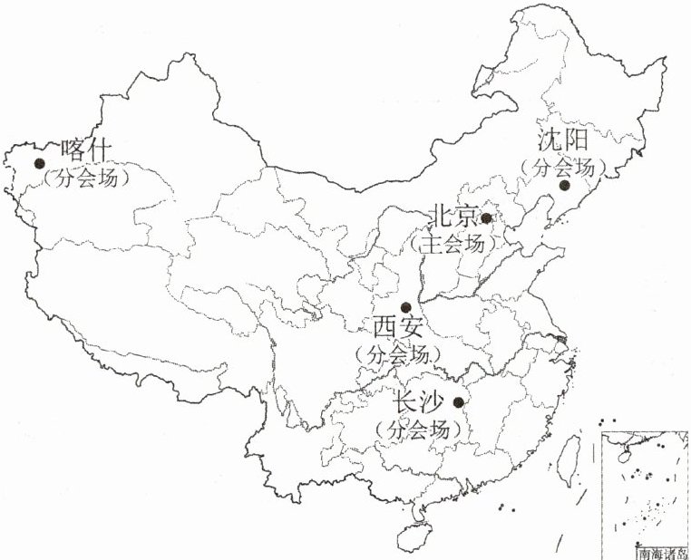我国2024年春节联欢晚会于2月9日(大年三十)20点(北京时间)准时开播,四个分会场分别设在沈阳、长沙、西安、喀什。开播时沈阳已是万家灯火,而喀什仍处在落日余晖之中。读我国2024年春晚会场分布示意图,完成8~9题。