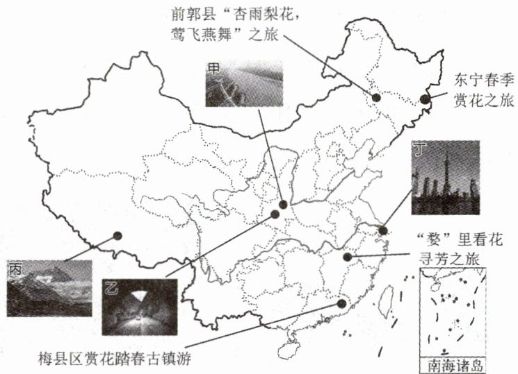 (3)冬去春来,大江南北、长城内外一片繁花似锦。图中赏花时间最早的旅游线路是