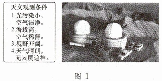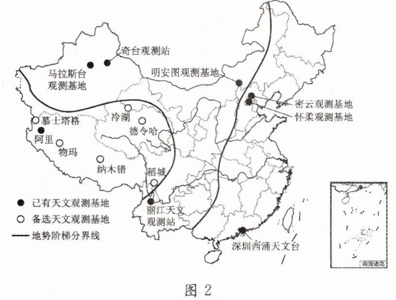 图 1 为天文观测条件资料卡与冷湖天文台景观图,图 2 为我国部分天文观测基地分布图。据此完成 11~12 题。