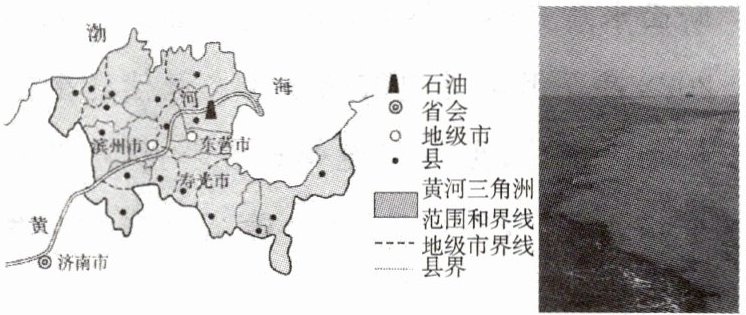 (济南中考)黄河含沙量巨大,河水携带大量泥沙在入海口处形成了“黄龙入海”的景观。下图为黄河三角洲示意图及“黄龙入海”景观图。据此完成9~10题。