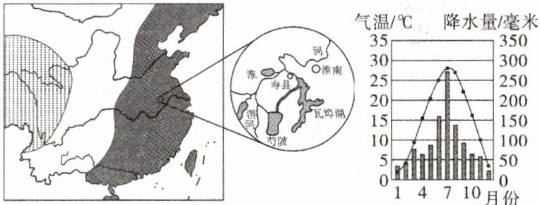 (文化遗产)陂(bēi)是我国古人依地势将周边水源引至低洼地汇集成塘,以保障农业灌溉的小型水利工程。芍陂(què bēi,现名安丰塘)位于安徽省寿县境内,被列入“世界灌溉工程遗产”名录。下图为芍陂位置图和寿县气温曲线和降水量柱状图。读图,完成8~9题。