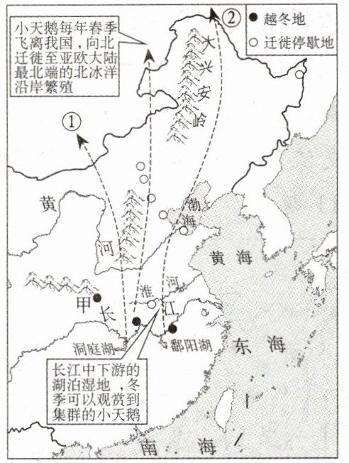 (滨州中考)读小天鹅在我国境内的主要栖息地和迁徙路线图,完成6~7题。