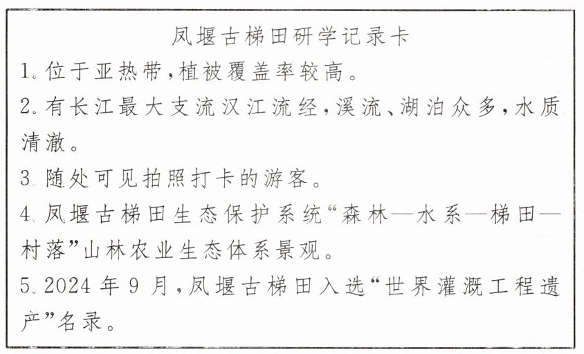 某中学地理兴趣小组来到位于陕西秦岭南部的汉阴县开展研学活动。该小组通过查阅资料和实地调查,制作了研学记录卡。读研学记录卡及凤堰古梯田景观图,完成1~3题。