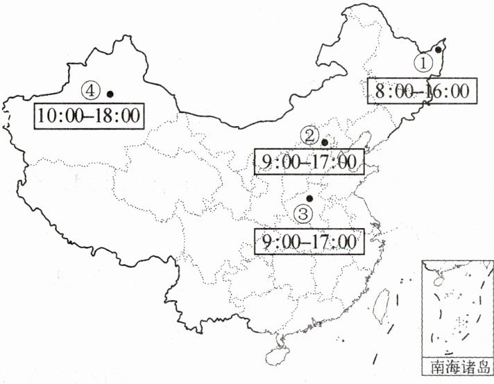 邮戳是邮局在信件、包裹等上加盖的戳记。邮政部门常会结合地域文化景观设计纪念邮戳。下图为我国部分邮局的位置和营业时间示意图。读图,完成 11~12 题。