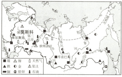 材料一 中国有西部大开发战略,而俄罗斯现在正拿出同样的劲头,开发其辽阔的东部,称为“东部开发计划”。俄罗斯不断加快的东部开发步伐也日益引起世界的关注。俄罗斯某著名经济学家曾一针见血地指出:“莫斯科不是俄罗斯。要想实现国家的经济复兴,必须实现西伯利亚和远东(即东部地区)与欧洲地区(西部地区)均衡发展。”下图为俄罗斯矿产资源分布示意图。