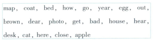 1 bed,egg,get,desk 2 map,bad,cat,apple 3 how,out,brown,house 4 coat,go,photo,close 5 year,dear,hear,here