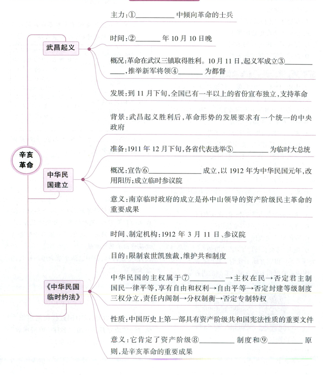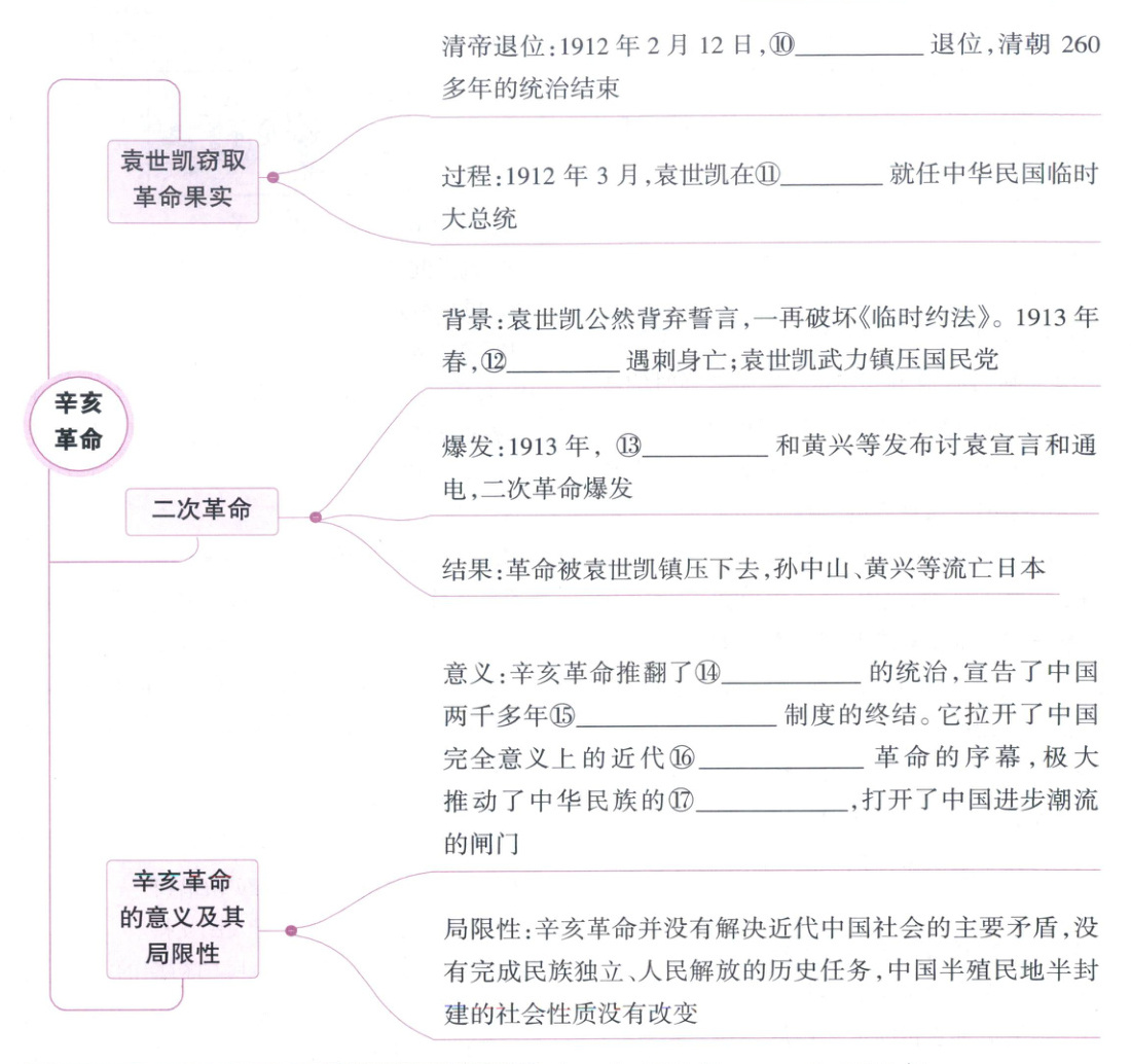 ①湖北新军 ②1911 ③湖北军政府 ④黎元洪 ⑤孙中山 ⑥中华民国 ⑦全体国民 ⑧共和 ⑨民主自由 ⑩溥仪 ⑪北京 ⑫宋教仁 ⑬孙中山 ⑭清朝 ⑮君主专制 ⑯民族民主 ⑰思想解放