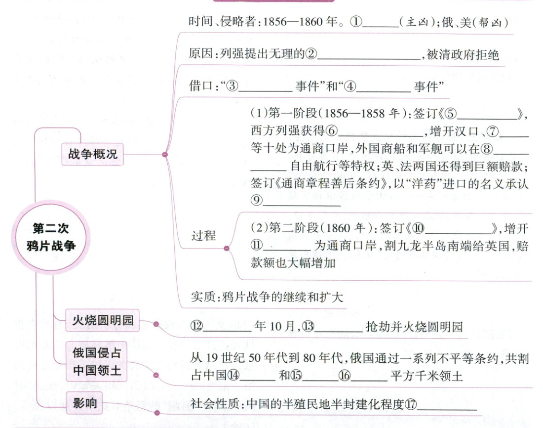 ①英、法 ②修约主张 ③亚罗号 ④马神甫 ⑤天津条约 ⑥外国公使进驻北京 ⑦南京 ⑧长江各口岸 ⑨鸦片贸易合法 ⑩北京条约 ⑪天津 ⑫1860 ⑬英法联军 ⑭东北 ⑮西北 ⑯150多万 ⑰进一步加深