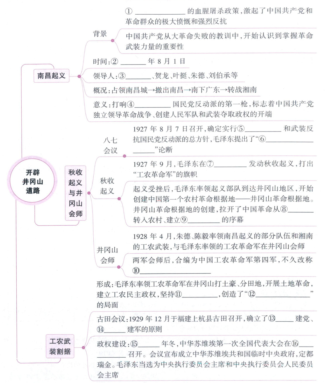 ①国民党反动派 ②1927 ③周恩来 ④武装反抗 ⑤土地革命 ⑦湘赣边界 ⑧城市 ⑨根据地 ⑩中国工农红军第四军 ⑪游击战争 ⑫工农武装割据 ⑬思想 ⑭政治 ⑮1931 ⑯江西瑞金