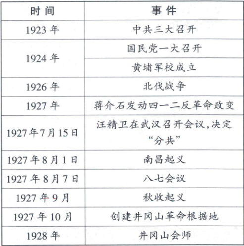 选取事件:秋收起义、创建井冈山革命根据地、井冈山会师。
