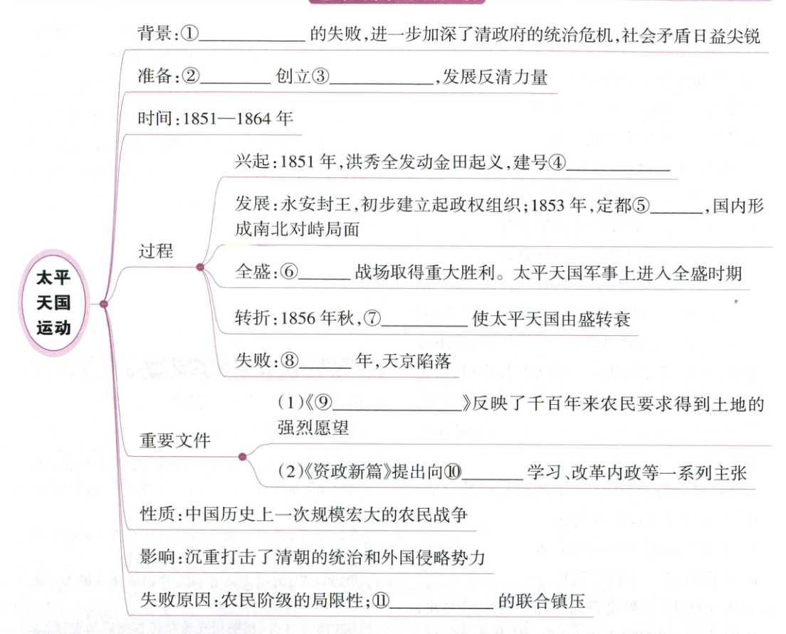 ①鸦片战争 ②洪秀全 ③拜上帝会 ④太平天国 ⑤天京 ⑥西征 ⑦天京事变 ⑧1864 ⑨天朝田亩制度 ⑩西方 ⑪中外反动势力