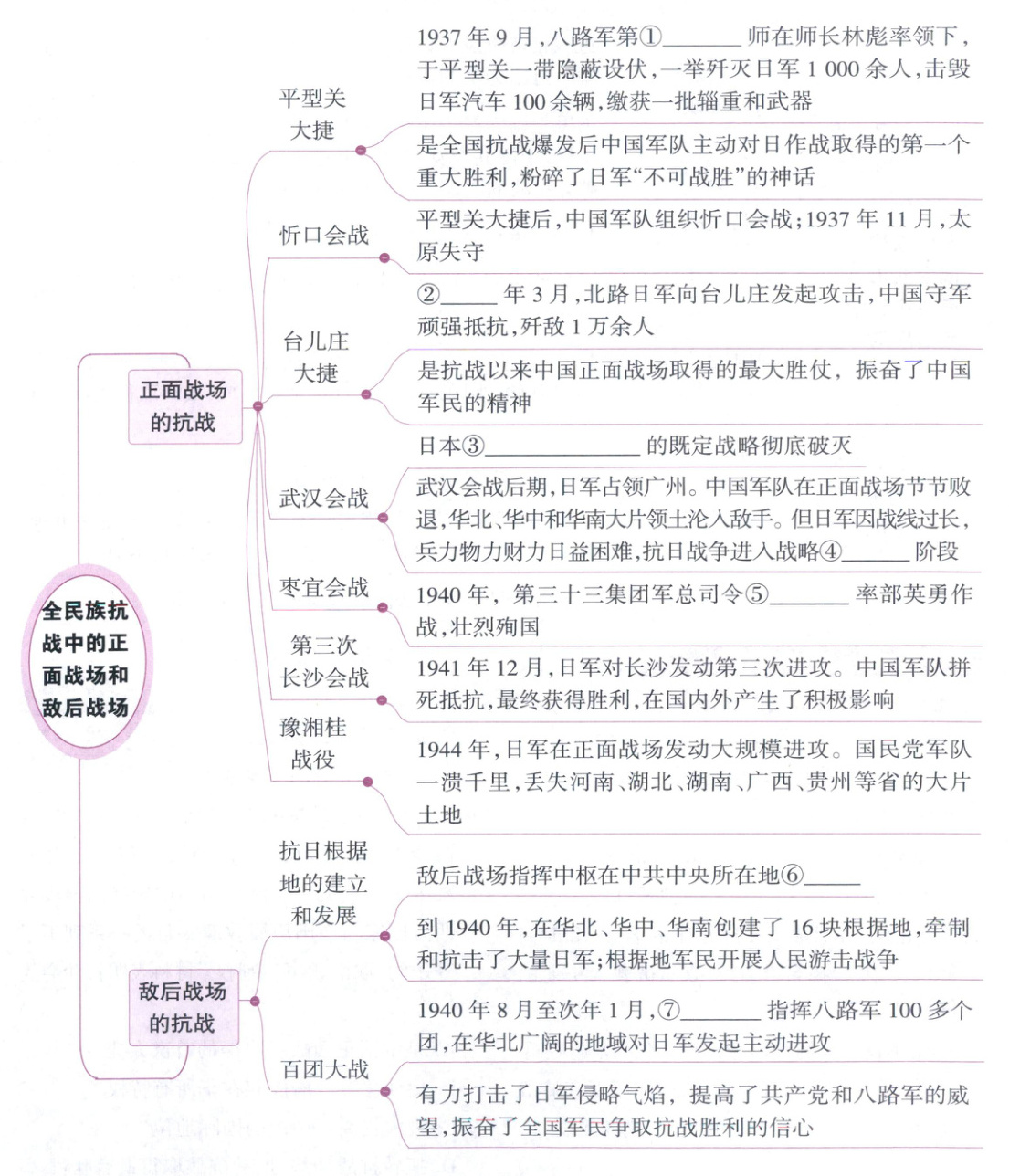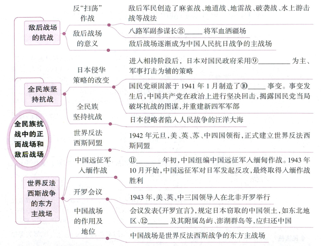 ①一一五 ②1938 ③迅速灭亡中国 ④相持 ⑤张自忠 ⑥延安 ⑦彭德怀 ⑧左权 ⑨政治诱降 ⑩皖南 ⑪1942 ⑫台湾