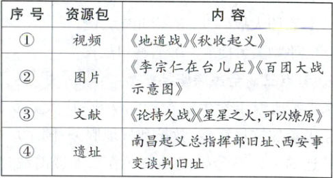 17. 中考新素材公众号 某历史公众号准备推送一期以“中华民族的抗日战争”为主题的资源包,下表所提供的资源包内容与主题相符的是(