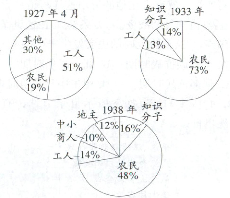 15. 跨数学饼状图 下图为不同时期中国共产党党员主要成员社会阶层比例分布情况。下图最能反映出中国共产党(