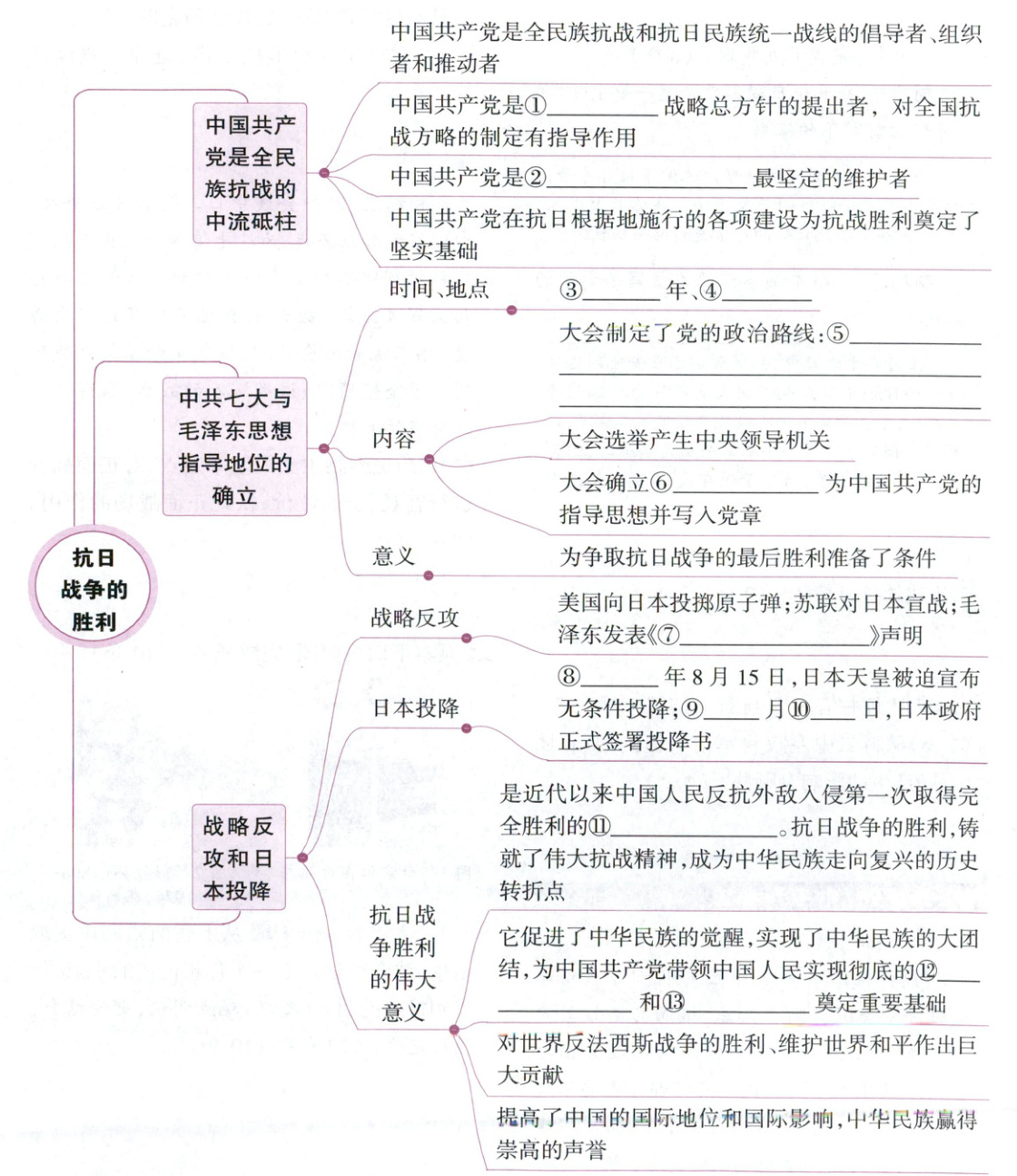 ①持久战 ②全民族团结抗战 ③1945 ④延安 ⑤放手发动群众,壮大人民力量,在中国共产党领导下,打败日本侵略者,解放全国人民,建立一个新民主主义的中国 ⑥毛泽东思想 ⑦对日寇的最后一战 ⑧1945 ⑨9 ⑩2 ⑪民族解放斗争 ⑫民族独立 ⑬人民解放