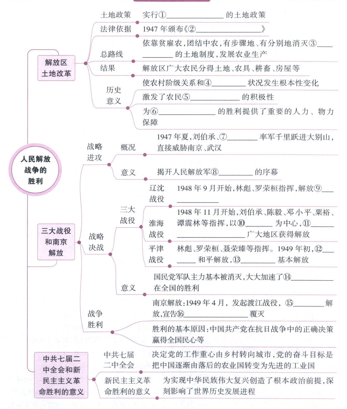 ①耕者有其田 ②中国土地法大纲 ③封建性剥削 ④土地占有 ⑤革命和生产 ⑥人民解放战争 ⑦邓小平 ⑧战略进攻 ⑨东北全境 ⑩徐州 ⑪长江中下游以北 ⑫北平 ⑬华北全境 ⑭人民解放战争 ⑮南京 ⑯国民党反动统治