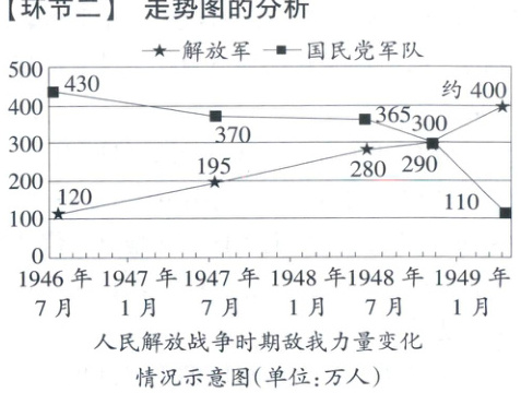 (3)具体变化:两党的军队差距逐渐缩小;人民解放军最终超过了国民党军队。主要战事:三大战役和渡江战役等。