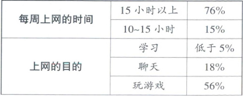 (1)大部分同学上网时间过长;多数同学上网的目的主要是休闲娱乐,部分同学通过网络接触了不良信息;部分同学进入过未成年人不该进入的场所。