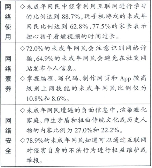 依据材料中的数据,请你对未成年网民上网情况作出总结。(6 分)