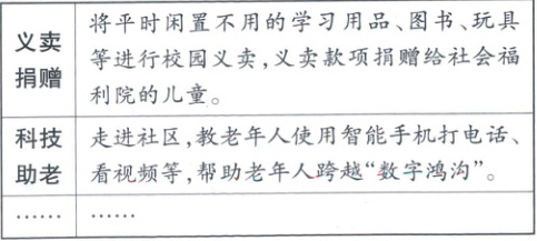 (2)示例一:(志愿服务)在马拉松比赛中担任志愿者,提供接待、引导等服务。 示例二:(环境保护)参与学校组织的环保活动,前往校区附近的公园捡拾垃圾等。
