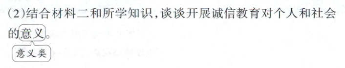 (2)①对个人:人以诚信立身。诚信是我们做人做事的基本准则,是一种对他人和社会的责任,体现我们的内在修养与道德品质。一个人真诚老实、笃守诺言,无论走到哪里都能赢得信任,拥有更多的发展机会和更大的发展平台。相反,如果弄虚作假、口是心非,就会处处碰壁,甚至无法立身处世。②对社会:诚信促进社会文明。社会成员之间只有以诚相待、以信为本,才能增进社会互信,减少社会矛盾,净化社会风气,促进社会和谐。
