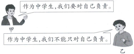 (1)珍爱生命、勇担责任、见义智为等。(2)示例一:甲同学。理由:对自己负责,有助于充分挖掘和发挥自己的潜能,更好地承担起对他人、社会和国家的责任。作为学生,首先要对自己的身心健康和学习成长负责。示例二:乙同学。理由:每个人在受惠于他人的同时,要履行好对他人应尽的责任。我们要有强烈的主人翁意识和社会责任感,关心国家大事,将个人成长进步与国家社会发展紧密结合起来,以实际行动报效祖国、服务人民、奉献社会。(3)对自己负责、对家庭负责、对他人和集体负责、对国家和社会负责。